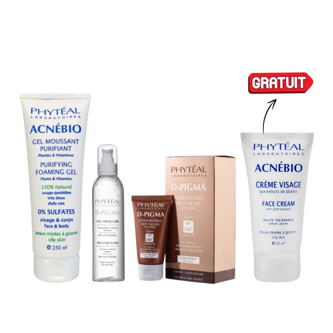 1 PACK PHYTEAL PHYTEAL DPIGMA ECRAN INVISIBLE SPF100+ 50ML + DPIGMA EAU MICELLAIRE A L’ALOE VERA 150ML OFFERTE + ACNEBIO GEL NETTOYANT 250 ML + OFFERT